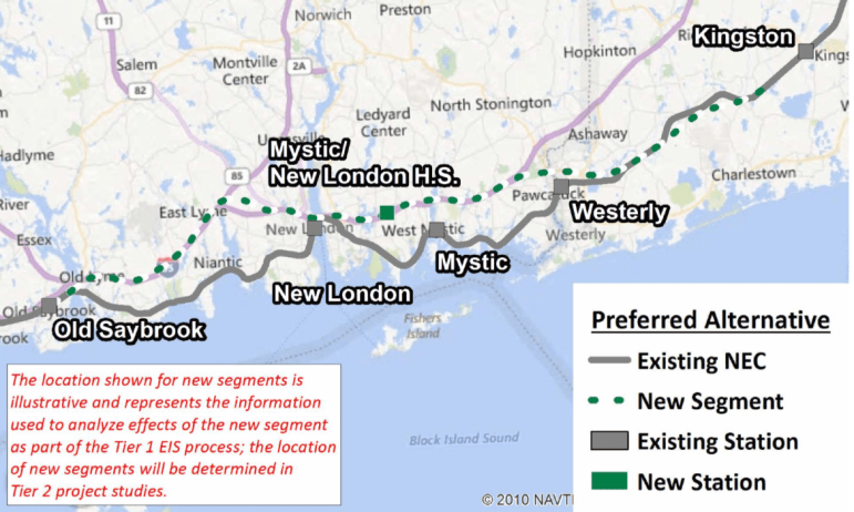 While eight states are involved in NEC Future, all through the planning process Connecticut was viewed as a “bottleneck,” it’s old, curved tracks, especially those that hugged the coastline, an impediment to upgrading rail transportation in the Northeast.