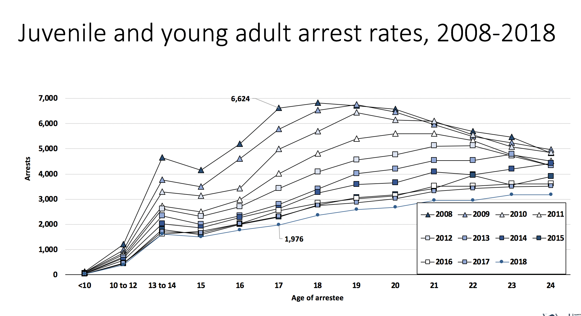 Juvenile and young adult arrest rates have fallen sharply as well, Lawlor said, which he credited to a number of reforms that have prevented children from being kicked out of school and fueling the “school-to-prison pipeline.”