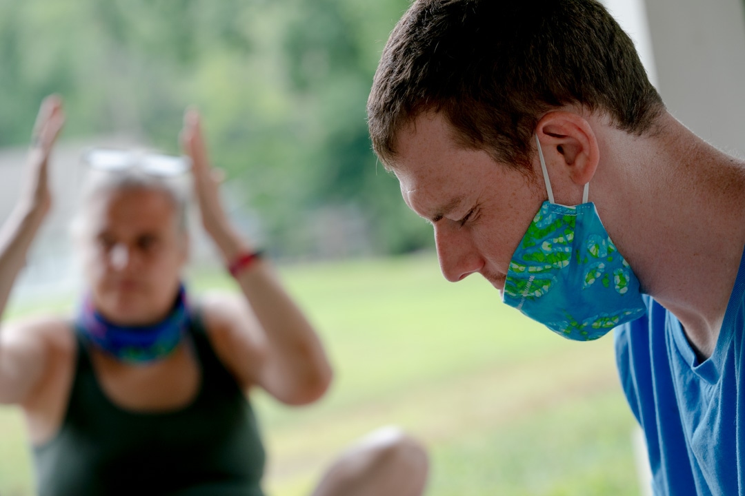 Matt King, right, meditates during a yoga class on Friday, July 31 at Horizons in South Windham. Wearing a mask during activities is necessary, but also adds a challenge. “It’s a difficult thing when you’re communicating with people who usually read your whole body language in the communication,” said Chris McNaboe, CEO founder. Credit: Yehyun Kim / ctmirror.org