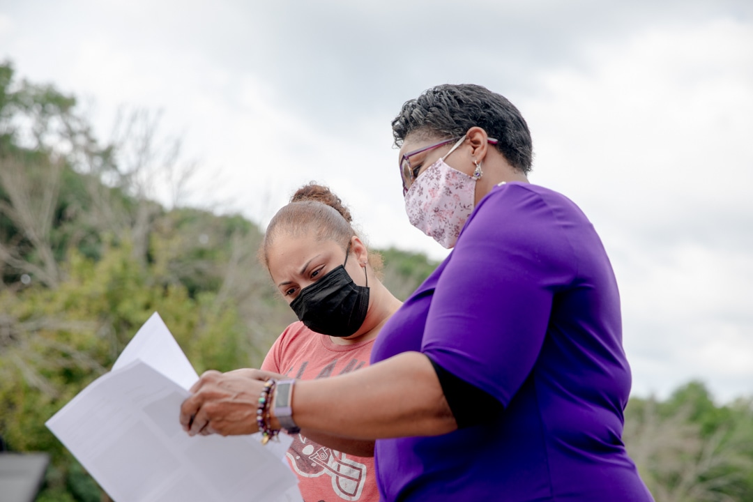 Jakota Valentin, left, listens to instruction from Lori Thompson on Thursday, Aug. 13 at Mayberry Elementary School. Valentin said that she chose online learning for her daughter entering a kindergarten because Valentin stays home and she doesn’t want to risk her child’s health. Credit: Yehyun Kim / ctmirror.org
