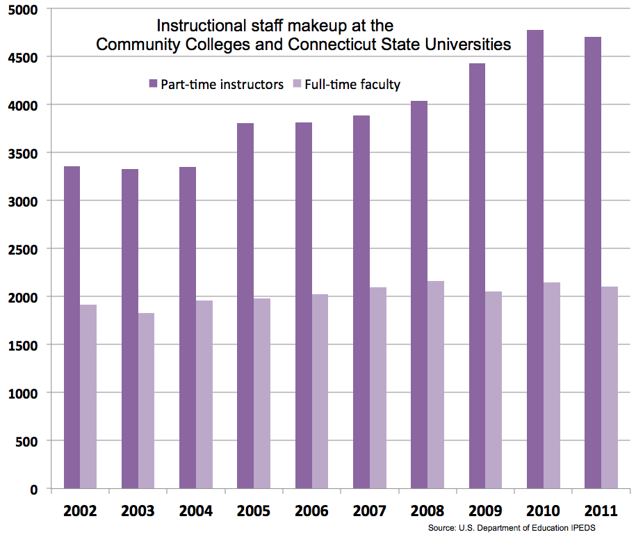 The Board of Regents has heavily relied on part-time adjuncts to teach students as enrollment increased and money for more expensive and experienced faculty has decreased. Over the last five years, as enrollment increased by 12.4 percent, full-time faculty stayed the same and part-time staff increased by 29.4 percent at the community colleges and 9.4 percent at the Connecticut State Universities, reports the U.S. Department of Education.