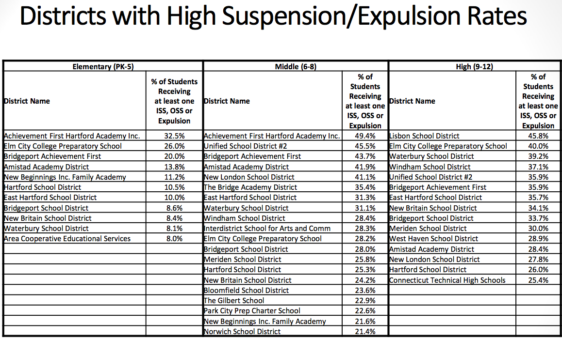 The State Department of Education reports that one in two students who attend the middle school in Hartford will be suspended at some point during the year, the highest rate in the state.