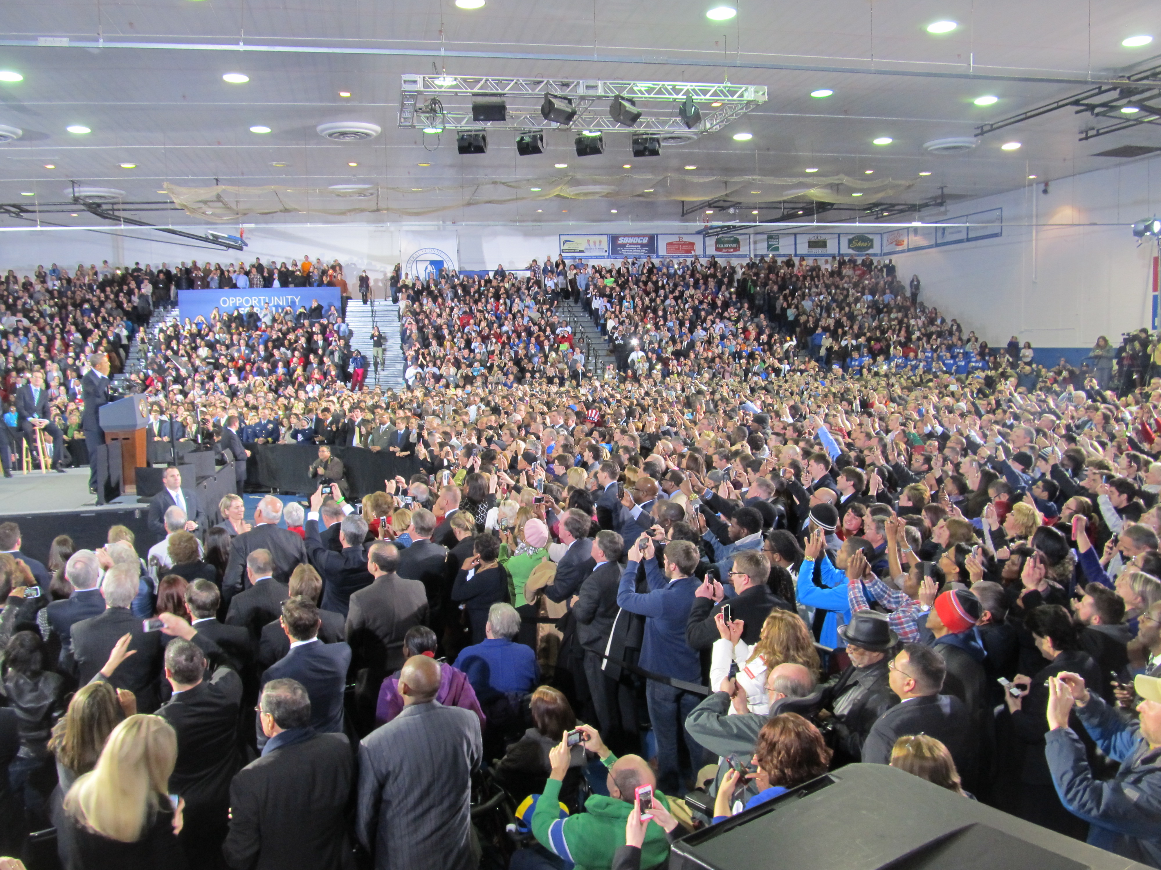 Obama spoke to a standing-room audience of about 3,000 at Detrick Gymnasium at Central Connecticut State University. He was introduced by Gov. Dannel P. Malloy, whose defense of the president’s economic policies against criticism by Gov. Bobby Jindal outside the White House was seen by many here as a spur for the president’s visit.