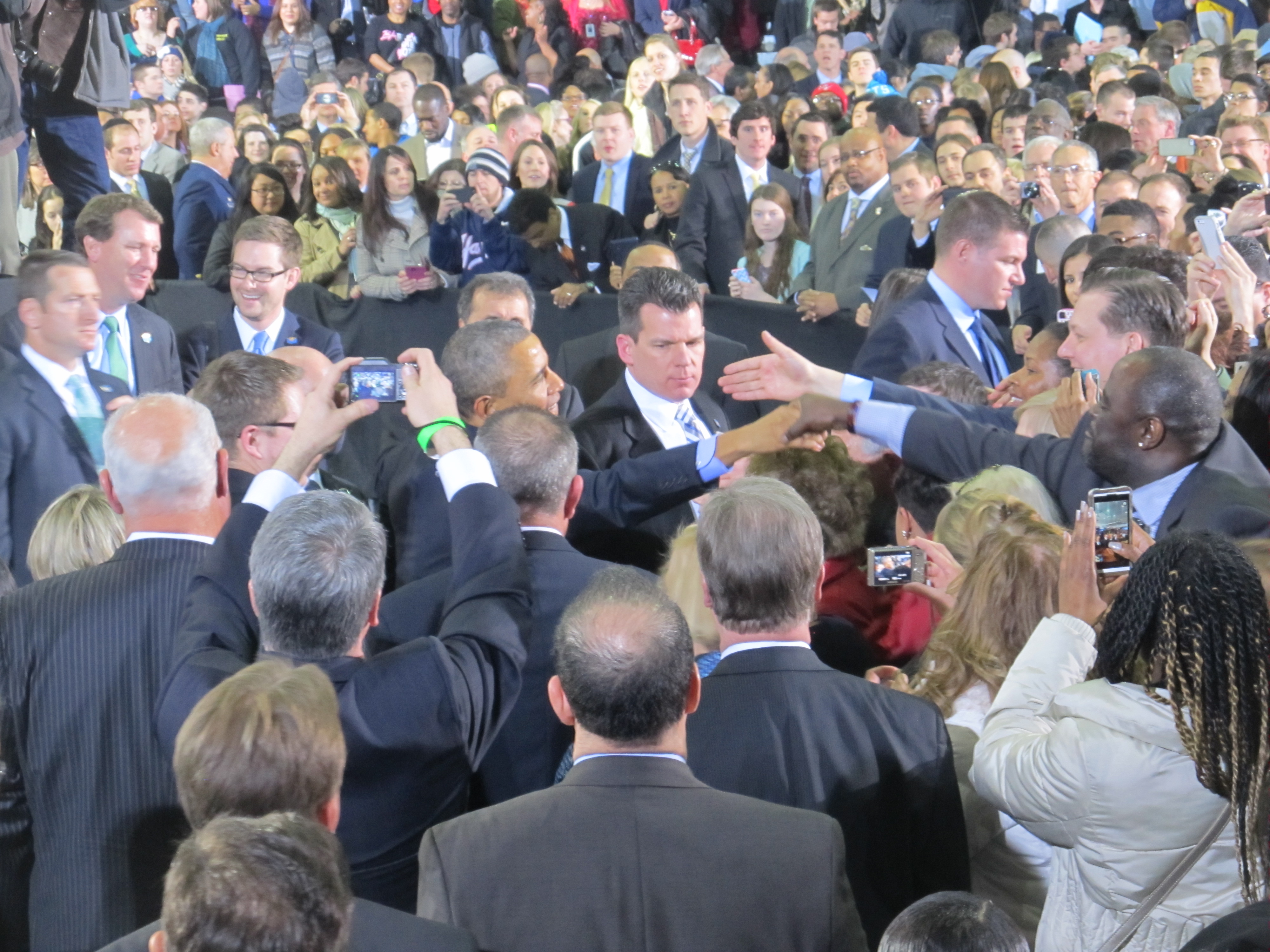 The president spoke for 30 minutes, finishing at 2:51 p.m. As a band played marching music, Obama stepped off the stage and shook hands with spectators.