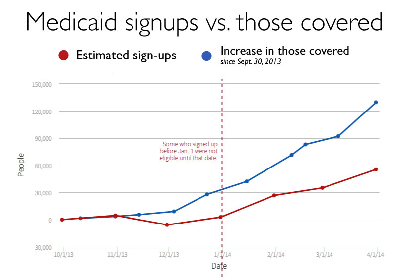 The two numbers are not necessarily contradictory. The 129,588 figure Access Health has used represents people who signed up for Medicaid from Oct. 1 to March 31, while the DSS figure — 72,741 more enrollees as of the end of April — reflects program enrollment after accounting for people who dropped out of Medicaid.