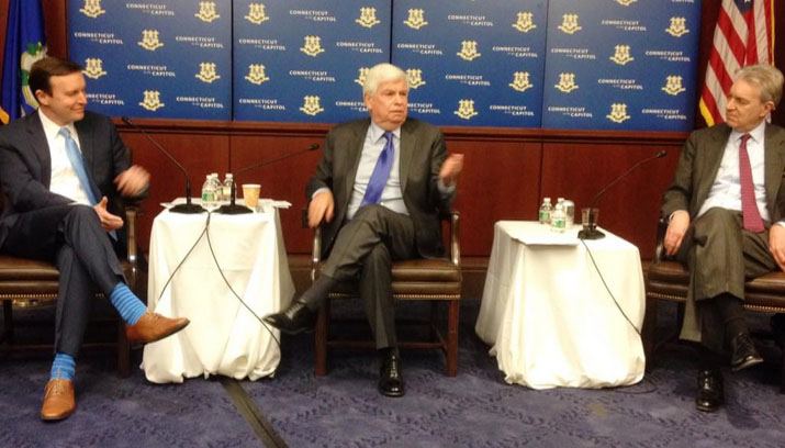 Sen. Chris Murphy, left, with former Sen. Chris Dodd and Healthcare.gov CEO Kevin Counihan, right, at the “Connecticut at the Capitol” event.