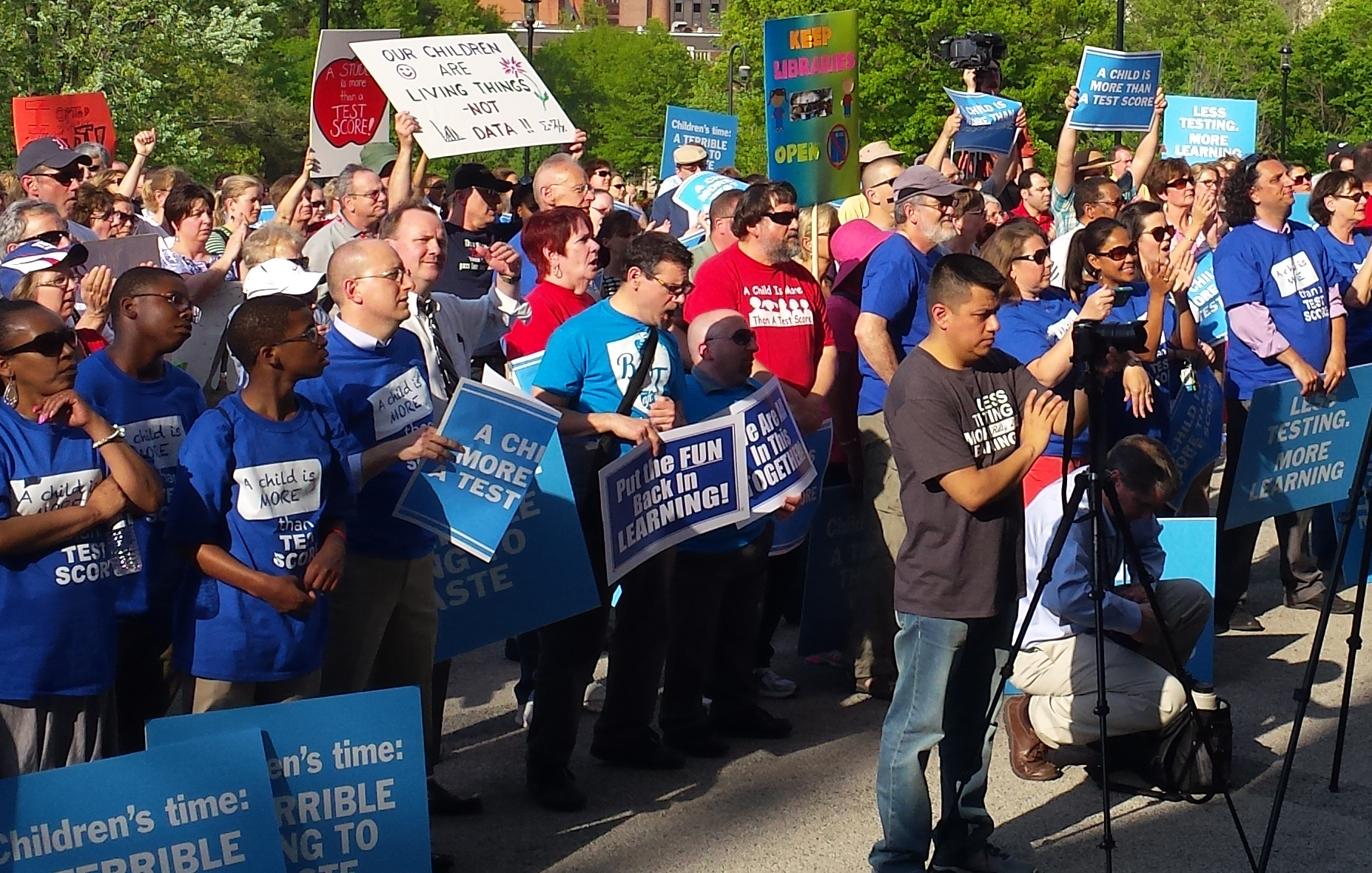 “Put the test to rest,” she chanted with the crowd, holding up a sign that read, “A child is more than a test score.”