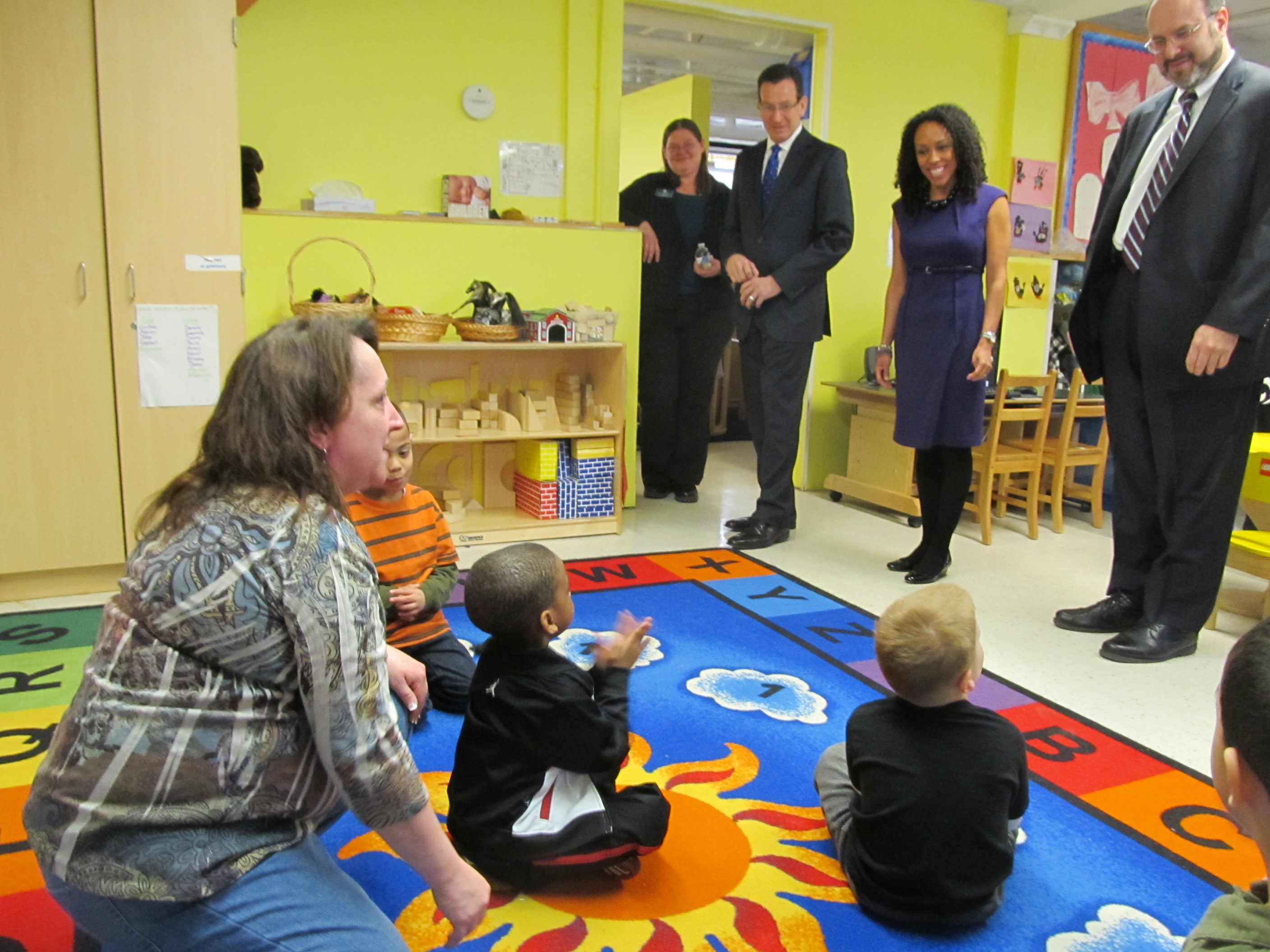 Gov. Dannel P. Malloy visits a preschool classroom in Meriden with his commissioner of the Office of Early Childhood.