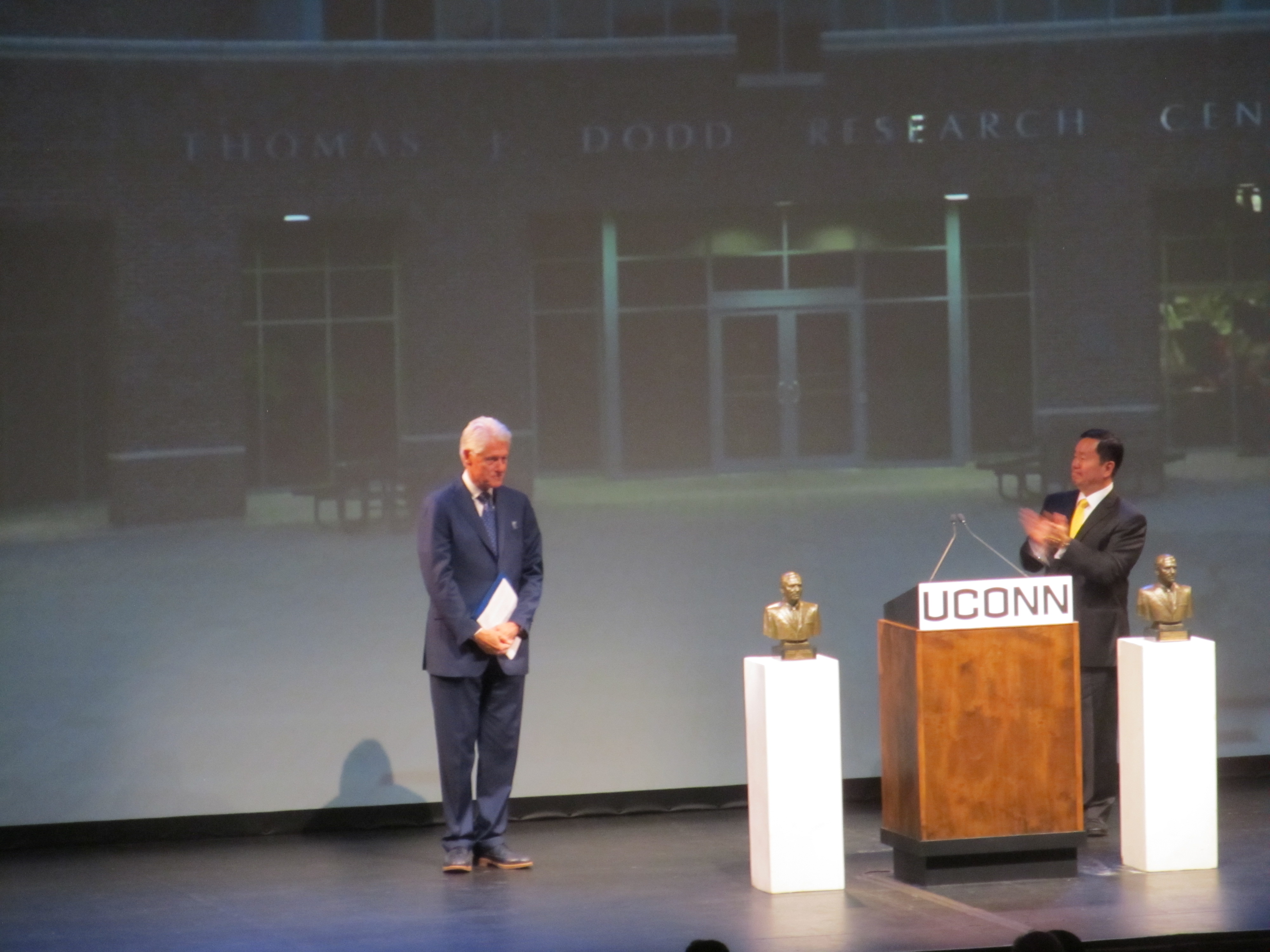 Exactly 20 years after Clinton helped dedicate the Thomas J. Dodd Research Center during the third year of his presidency, he returned to the University of Connecticut campus on behalf of his foundation to accept the Dodd Prize for international justice and human rights.