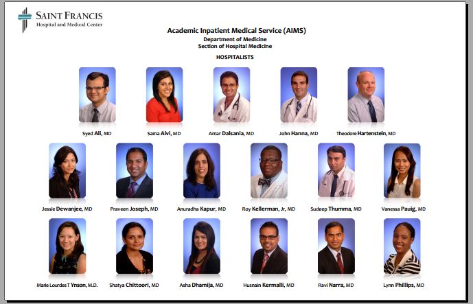 Some hospitals try to make the distinctions clearer by having staff wear different colors depending on their discipline, or giving staff large nametags that say their job title. At St. Francis, the hospitalists developed a flyer with the doctors’ names and photos to show patients so they know who to expect.