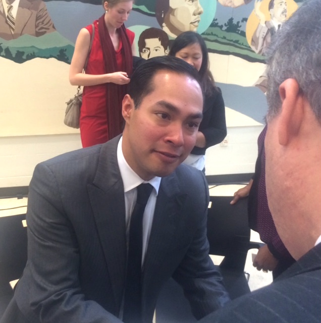 HUD Secretary Julián Castro talks to state Rep. Edwin Vargas. Credit: Mark Pazniokas / CTMirror.org