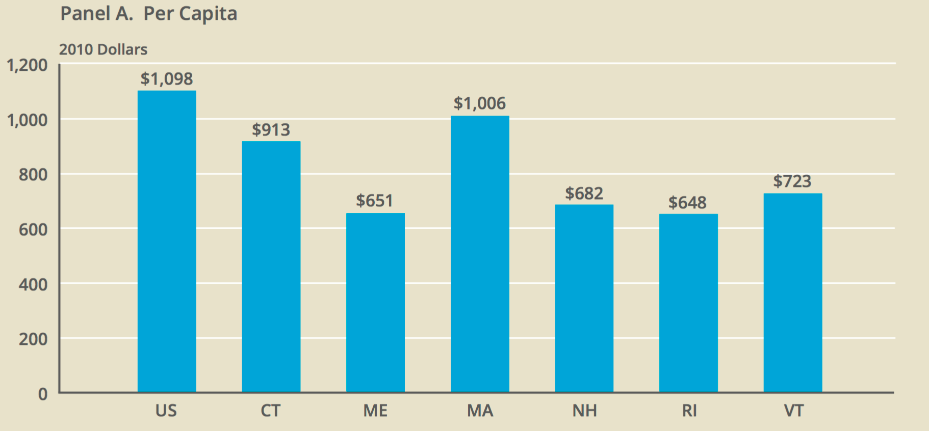 State and local capital spending per capita in the six New England states vs. the national average, 2000 to 2012. Credit: New England Public Policy Center