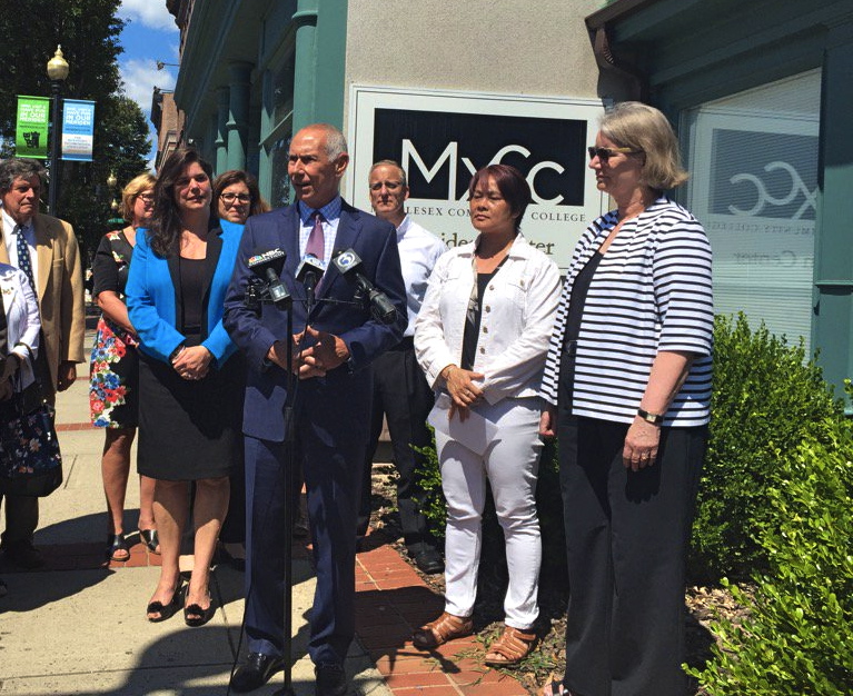 CSCU President Mark Ojakian, flanked by legislators and other college leaders, announces the Meriden campus of Middlesex Community College will stay open Credit: CSCU
