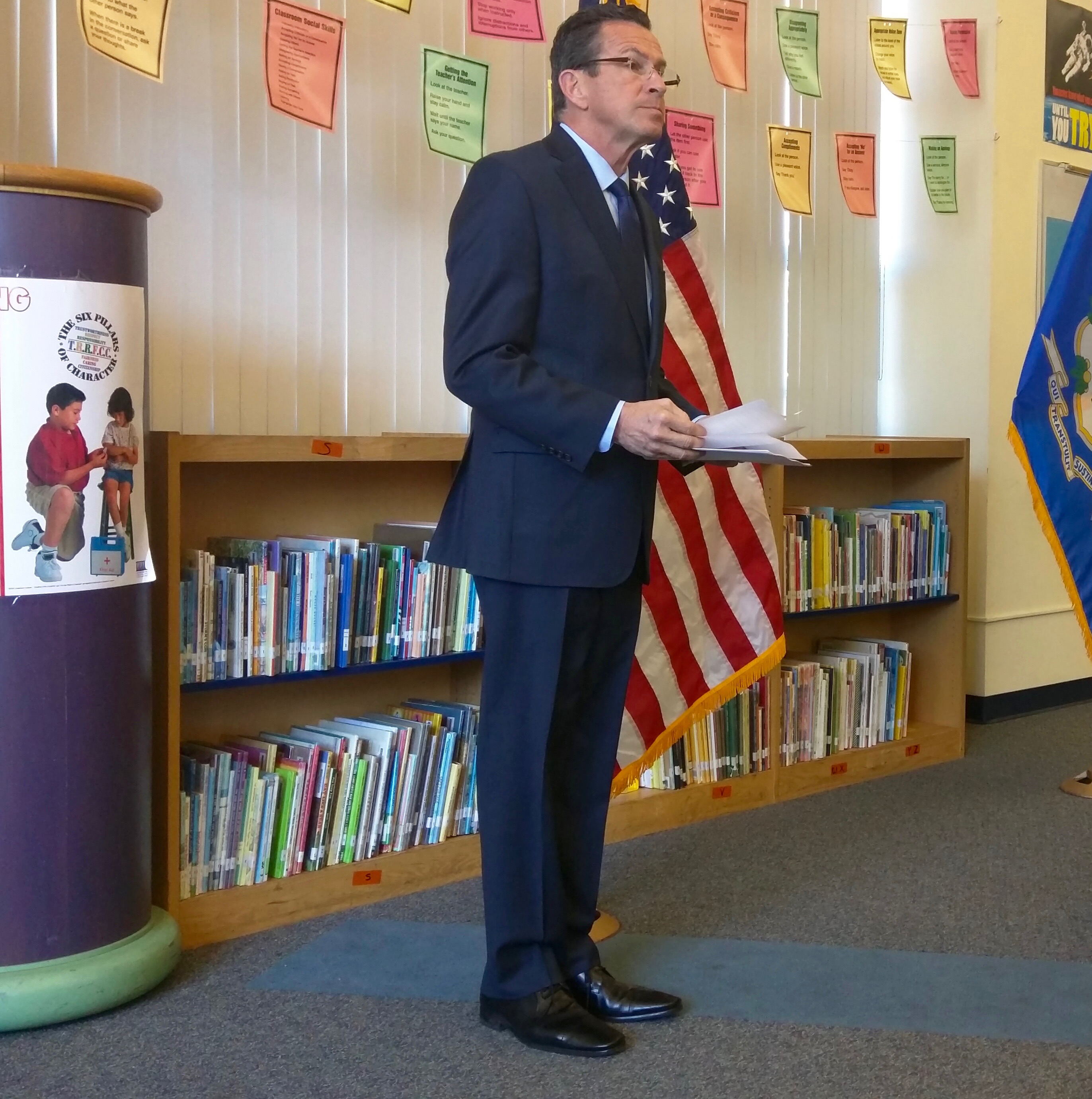 New Britain – Standing in the library of an elementary school that was at the center of a recent school-funding trial, Gov. Dannel P. Malloy Monday released his plans for redistributing existing levels of state education aid in ways he said would help the most impoverished school districts.