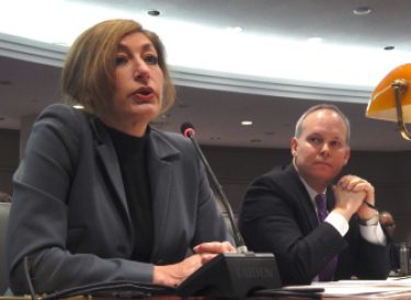 UConn President Susan Herbst testifies before the Appropriations Committee. At right is Scott Jordan, the university’s budget chief. Credit: Kyle Constable / CTMirror.org