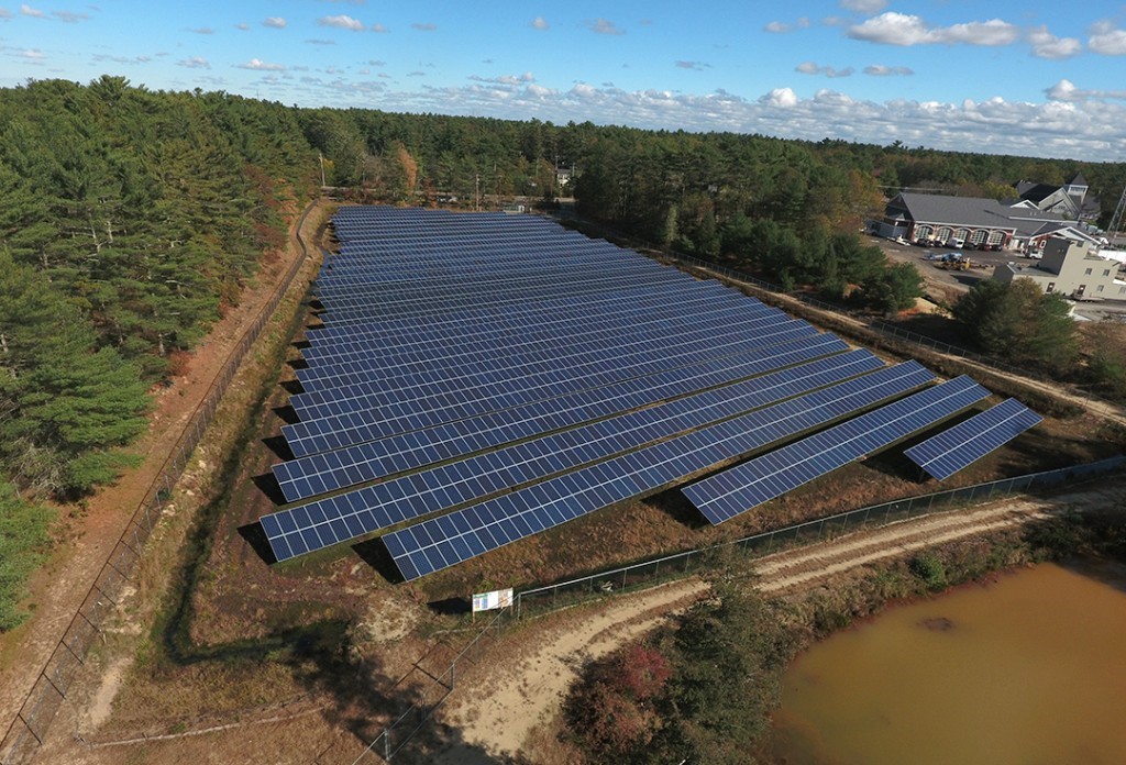 Solar panels mounted over a cranberry bog in Carver, Mass. Cranberries need some shade anyway, said bog owner Michael Paduch. Credit: Courtesy of Lodestar Energy