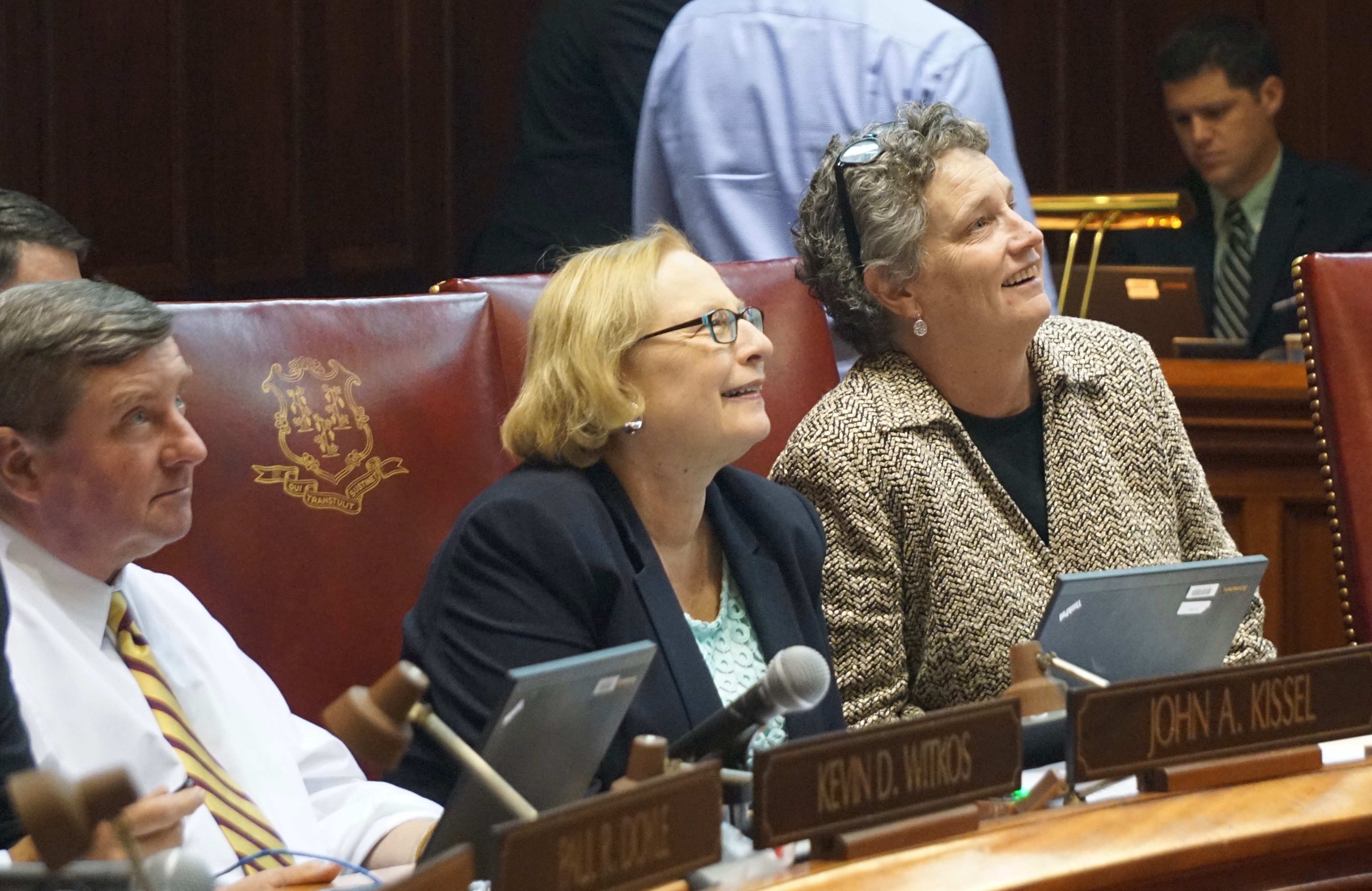 Sens. John Kissel and two legislators who led the Senate debate for passage, Terry Gerratana and Beth Bye, watch votes cast.