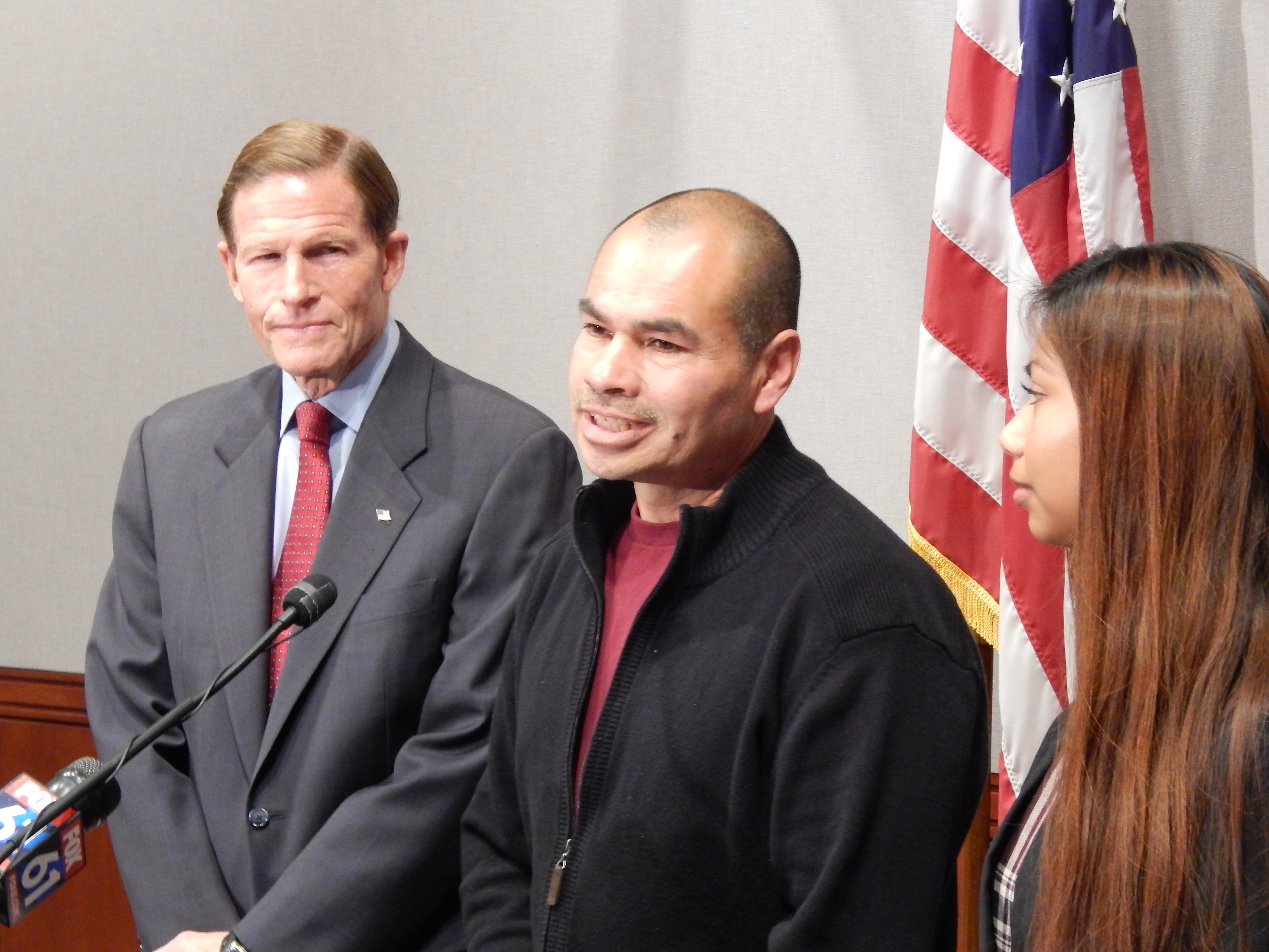 Luis Barrios speaks with reporters at the state Capitol complex in Hartford. Sen. Richard Blumenthal, left, and Barrios’ daughter, Jessica, right, stand behind him. Credit: Kyle Constable / CTMirror.org