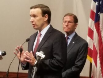 Senators Chris Murphy and Richard Blumenthal speak at a press conference Monday. Credit: Schae Beaudoin / CTMirror.org