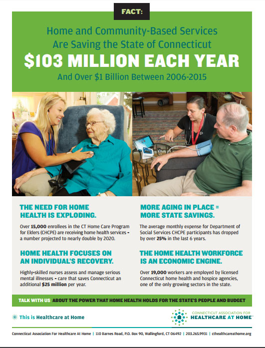 DSS data indicates that home and community-based providers under the CT Home Care Program for Elders and other home-based programs saved the Connecticut State budget $1 billion over the past 10 years.