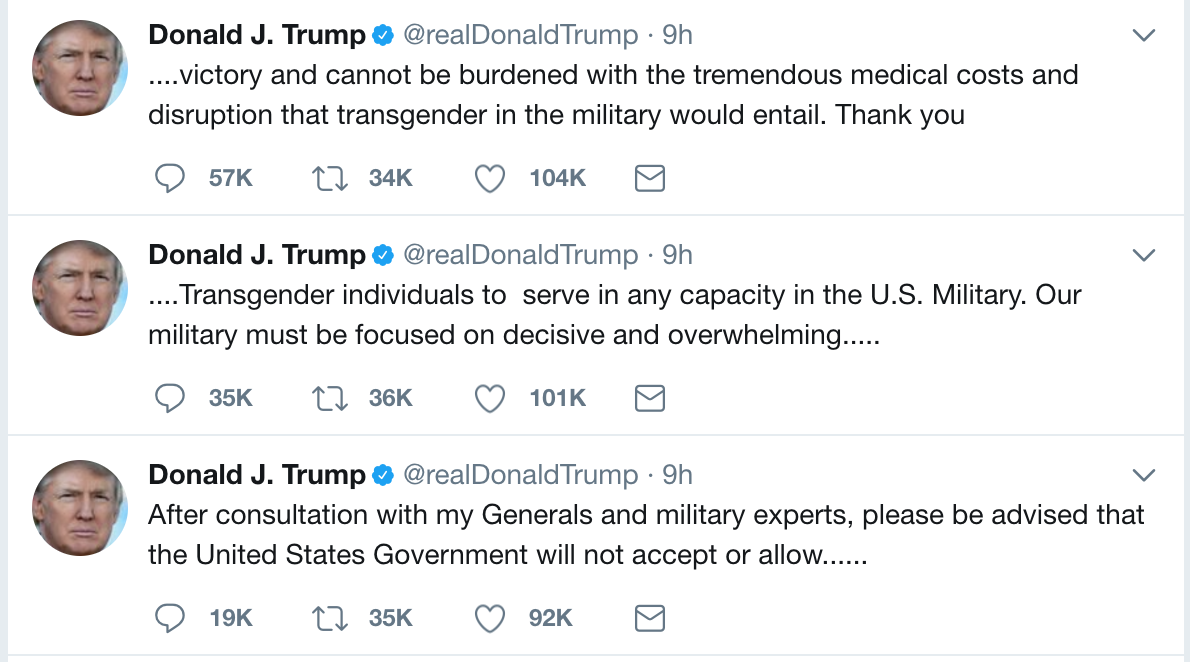 Last month, Defense Secretary James Mattis announced he would delay for six months a decision on whether transgendered recruits could join the military. Trump’s tweets now indicate that policy will never be implemented and cast doubt on the future of those transgender individuals now serving in the armed forces.