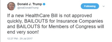 Over the weekend, President Donald Trump tweeted, “If a new HealthCare Bill is not approved quickly, BAILOUTS for Insurance Companies and BAILOUTS for Members of Congress will end very soon!”