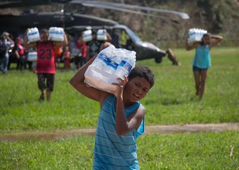 Residents of Jayuga, Puerto Rico, unload food and water from an Army Black Hawk helicopter assigned to the 101st Combat Aviation Brigade, 101st Airborne Division on Oct. 18. Credit: U.S. Army Cyber Command
