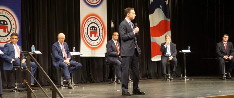 Mike Handler opens the Republican forum in Windsor. From left, Prasad Srinivasan, Dave Walker, Peter Lumaj, Steve Obsitnik and Tim Herbst. Toni Boucher arrived late. Credit: ctmirror.org