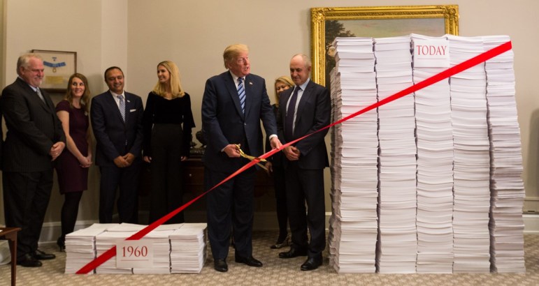 At a recent event to tout his administration’s efforts to rid the federal government of what he contends is burdensome red tape, President Donald Trump used oversized gold scissors to cut a piece of red ribbon strung between two stacks of paper.