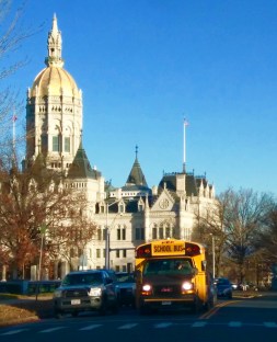 A school bus outside the state Capitol Credit: Jacqueline Rabe Thomas / CtMirror.org