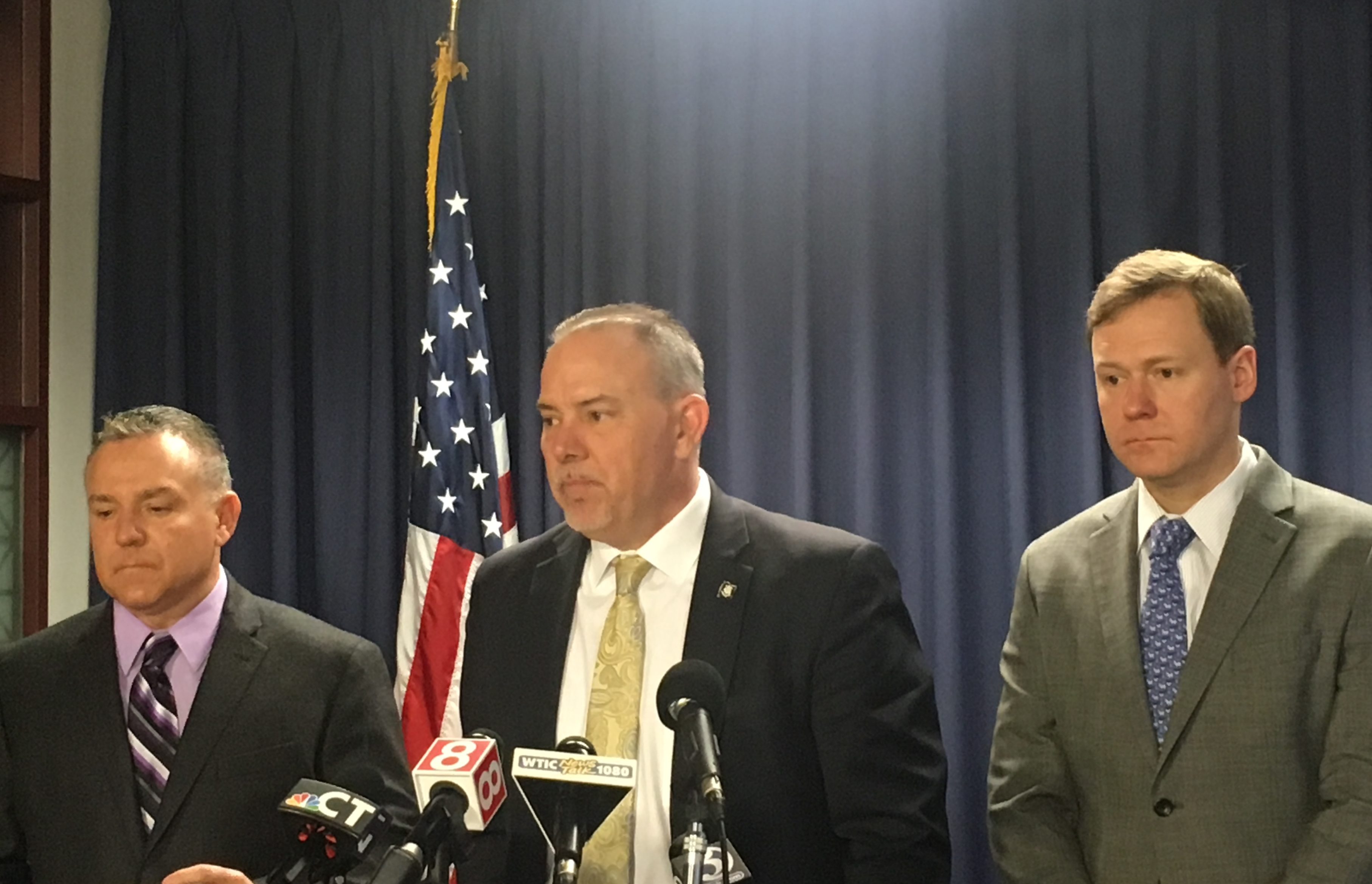 House Speaker Joe Aresimowicz, D-Berlin, flanked by Rep. Joe Verrengia, D-West Hartford, left, and House Majority Leader Matt Ritter, D-Hartford, right, speak to reporters. Credit: Clarice Silber / CTMirror.org