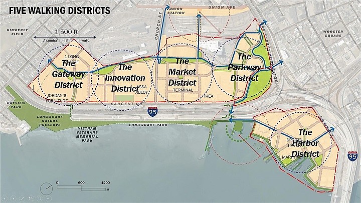 He said that the ASSA / Innovation District and the Gateway District, with their focuses on housing new tech businesses, medical facilities, recreational destinations and residential development, would similarly be connected to the other areas of Long Wharf by the ribbon park.
