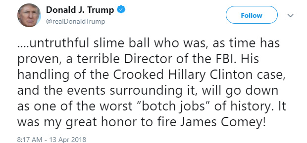 President Donald Trump had a lot to be angry about last week, starting with an FBI raid on his lawyer Michael Cohen’s offices and finishing with the impending release of former FBI director James Comey’s book. Among other unflattering things, it depicts the president as “unethical, and untethered to truth and institutional values.”