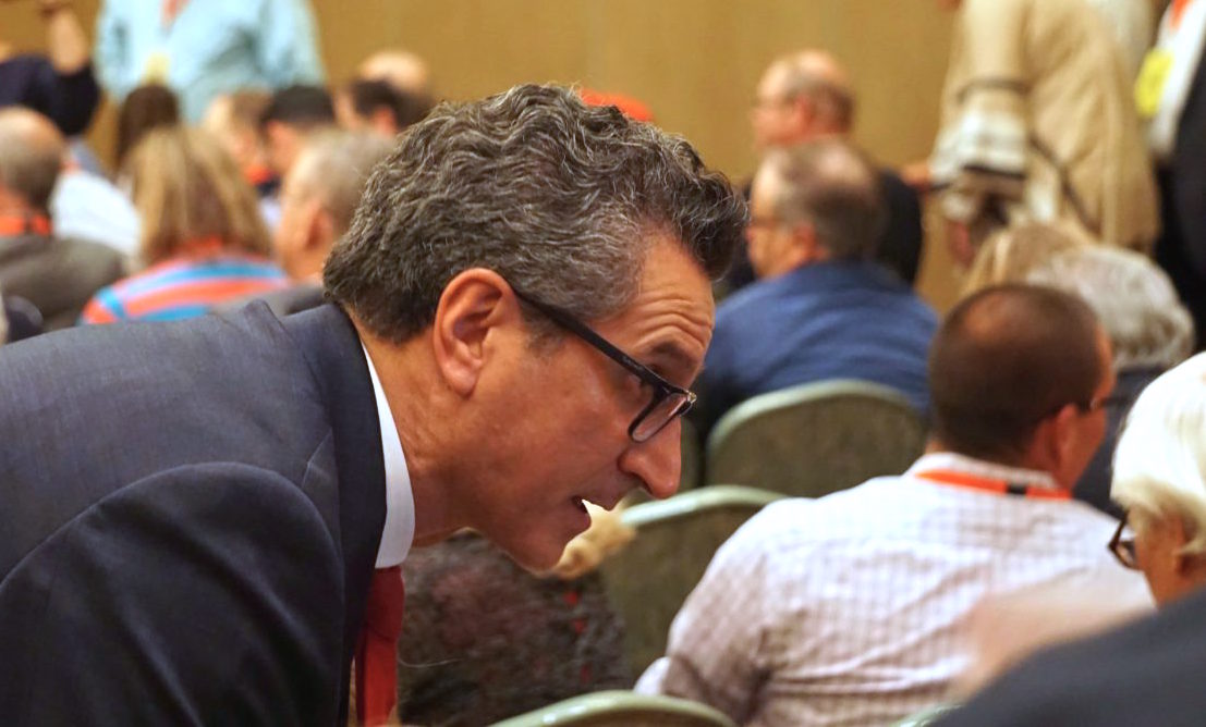 Manny Santos urging a delegate to switch his vote. Credit: Mark Pazniokas / CTMirror.org