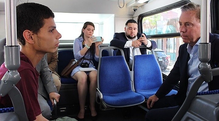 As the 212 bus left Downtown for Grand Avenue in New Haven, Skyler Shepard told Democratic gubernatorial frontrunner Ned Lamont about his recent struggles with homelessness.
