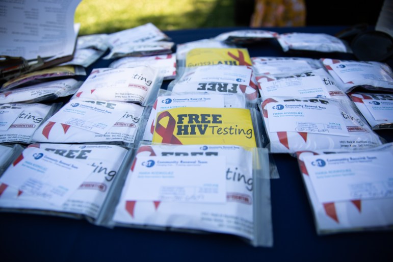 Barnard Park, off a busy intersection in Hartford, was on the schedule for a Friday summer morning. Rolon’s Nissan, parked on a shady strip of grass, became the impromptu HIV testing center. Results are ready in 20 minutes after the prick of a finger. Melendez and her colleagues set up a PrEP poster and a table with freebies such as umbrellas, condoms and water bottles to spark interest.