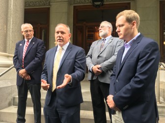 From left, Rep. Phil Young, D-Stratford, House Speaker Joe Aresimowicz, D-Berlin, Rep. Michael Winkler, D-Vernon, and House Majority Leader Matt Ritter, D-Hartford. Credit: Clarice Silber / CTMirror.org
