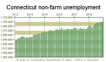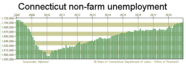 While across the public and private sectors, Connecticut gained 1,100 jobs in December it was the private sector that drove that growth. Private-sector employment in the state grew by 1,600 jobs in December, adding 23,500 over the year for a total 1,478,000. Government employment, which includes the state’s two tribal casinos, lost 500 jobs in December and 3,600 over the year, ending 2018 with 227,500 jobs.