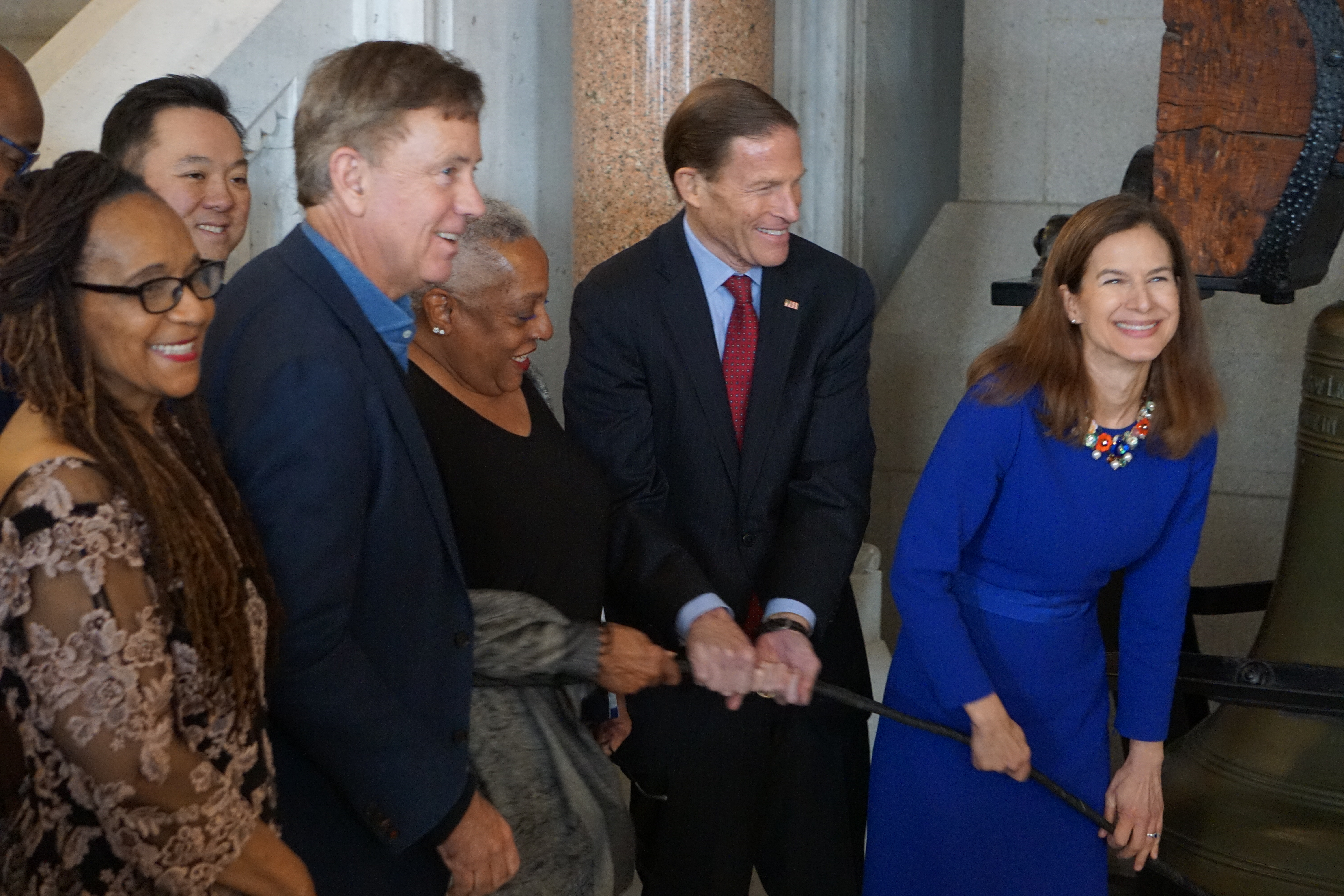 At the State Capitol, Lamont, Blumenthal, Bysiewicz, Wooden, Secretary of the State Denise Merrill and Attorney General William Tong attended the 33rd annual National Liberty Bell Celebration. Officials rang the Liberty Bell replica on display in the Capitol’s main floor.