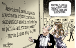 Bronin described a political cartoon by David Horsey of the Seattle Times published Monday in The Hartford Courant depicting a tuxedo-clad white man, cocktail in hand at a museum reception, looking an MLK display that featured this King quotation: “The problems of racial injustice and economic injustice cannot be solved without a radical redistribution of political and economic power.”