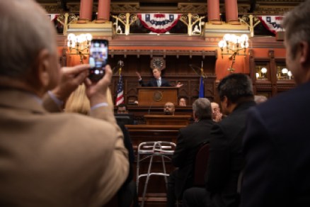 But other applause lines — promises of a higher minimum wage, a paid family and medical leave program, a pledge to preserve collective bargaining for state employees — only resonated among the majority Democrats.