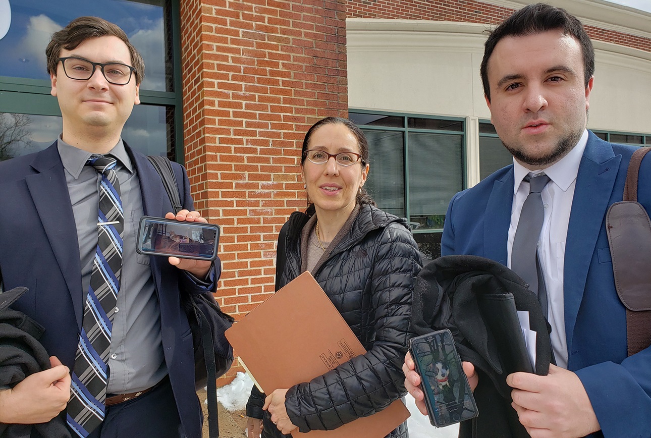 Rubin flanked by her two animal law clinic students earlier this month at the courthouse in Hartford, where they advocated for an abused dog in a legal case. Jesse Mangiardi, left, shows a cell phone picture of his two dogs, Thor and Luna, while Shaun Moloney, right, holds up a cell phone photo of his border collie, Jessica.