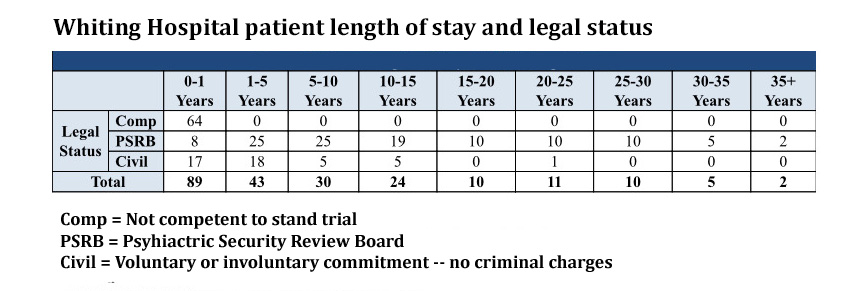 Of the 224 patients held at Whiting Forensic Hospital on June 28, a little more than half were hospitalized after being found not guilty of a crime by reason of insanity. The remaining patients at the state’s maximum security psychiatric hospital faced no criminal charges and were civilly committed, or were there to be restored to competency so their criminal cases could be resolved.