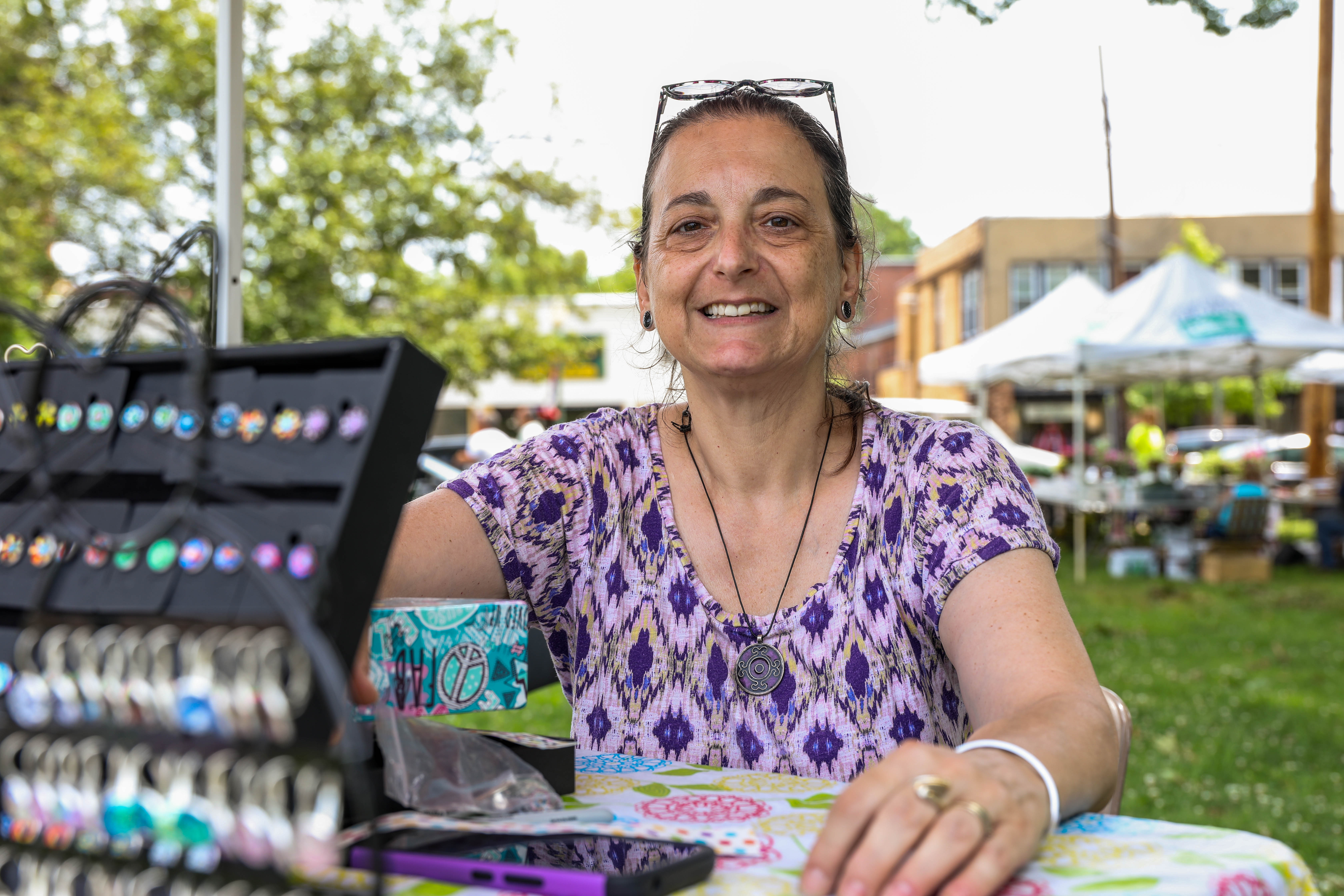 Katalin Berger, 57, sits in front of her jewelry stand at the West Haven Farmers Market. She says she is satisfied with life but is concerned with the amount of taxes she pays to Connecticut while her and her husband live on a fixed income. Credit: Carl Jordan Castro / C-HIT