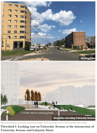 In the University of Bridgeport area, for example, it will look like a landscaped berm that will be easy for people to walk across where the road enters Seaside Park.