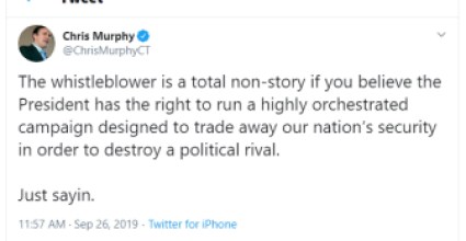 “The whistleblower is a total non-story if you believe the president has the right to run a highly orchestrated campaign designed to trade away our nation’s security in order to destroy a political rival. Just sayin,” Murphy tweeted on Thursday.