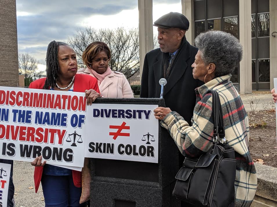 Following the court proceeding, the group gathered outside the court holding signs with slogans such as “Discrimination in the name of diversity is wrong” and “My race should not hurt me in admissions.”