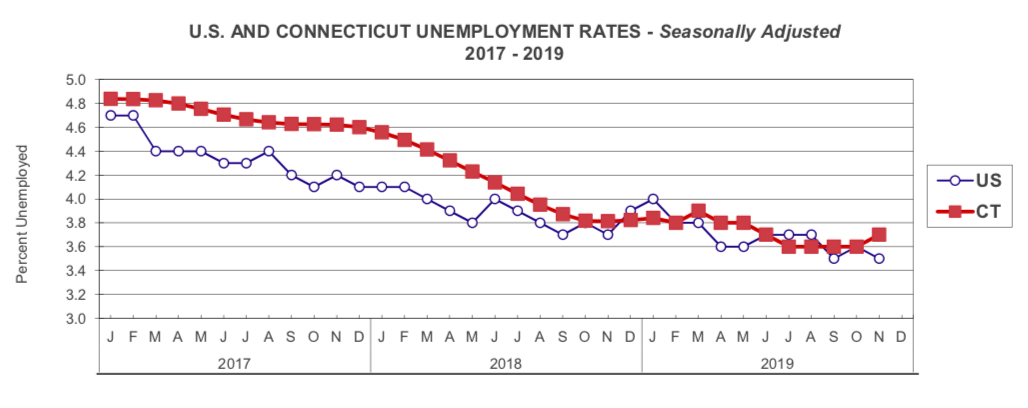 The Connecticut unemployment rate was 3.8% a year ago. The U.S. rate in November was 3.5%, down from 3.7% a year ago.