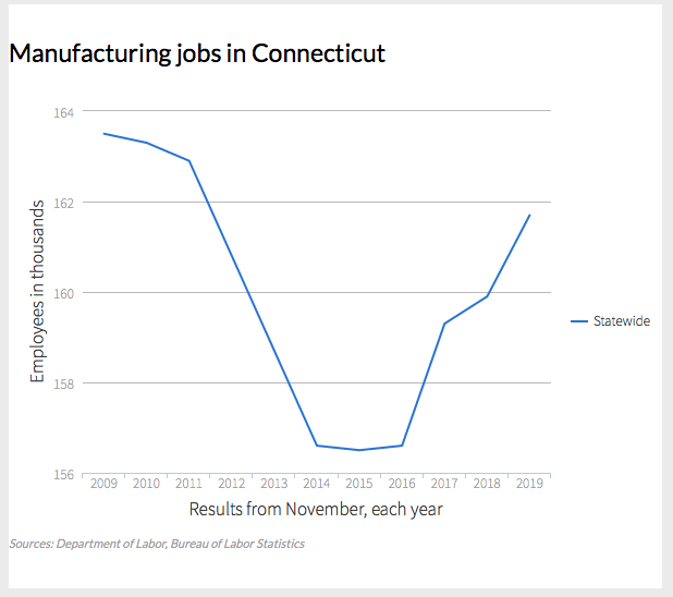 According to the Bureau of Labor Statistics, there were about 163,000 manufacturing jobs in Connecticut in November of 2009. Employment in the sector plunged to a low of about 157,000 in 2015 and, according to the bureau’s latest calculations, rose to about 162,000 as of November.