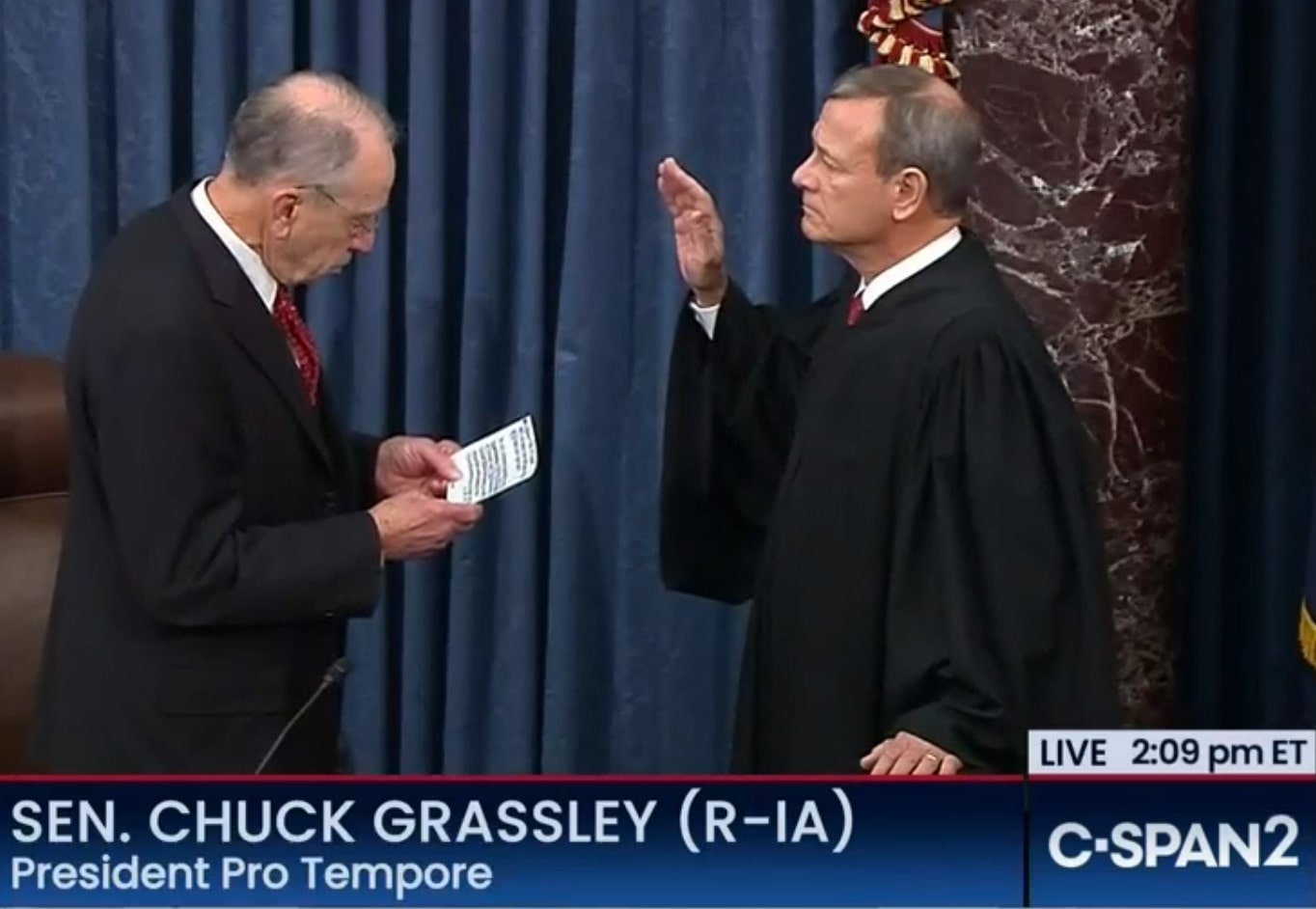 After the swearing in of senators and the presentation of the two charges of abuse of power and obstruction of Congress, Supreme Court Chief Justice John G. Roberts Jr., was sworn in to preside over the trial.